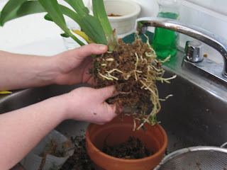 This weekend I repotted a few new orchids and I thought I would show you how I did it. They were a couple of mature orchids, two Cattleya hybrids and a Brassavola hybrid, not yet in flower. I did also buy a Doritaenopsis hybrid in flower, but I will hold off on repotting that until after it has flowered. I do not want to shock the plant while it is putting out such a tremendous flower, not to mention I do not want to run the risk of accidentally breaking off any buds. For the others, however, I know that spring is a good time for them to be repotted, and I could tell that they were pretty packed into the plastic pots in which I received them. In general, repotting newly purchased plants is a good idea because then you can be sure that they are well situated in the appropriate mix in their new home. Here is a quick guide to repotting your new orchid(s).